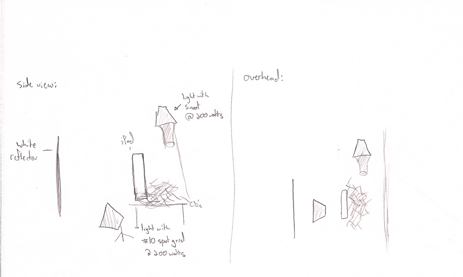 For this assignment I worked on shooting metal while my classmate Sarah shot glass. For metal, I used an iPod with broken shards of CD's surrounding it to represent the change in technology that has overcome the music industry in the last decade. In order to keep the iPod's shape and writing visible, I used a reflector and generally low lighting so as not to blow out the color. Below is the photo and lighting diagram.